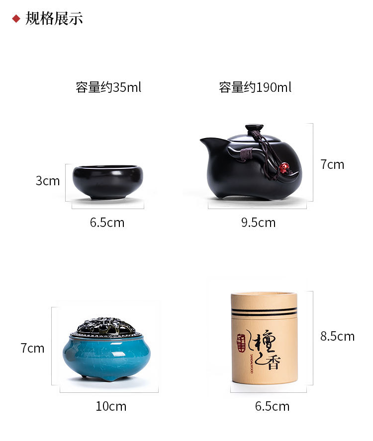 產品清單:茶壺*1   茶杯*2   檀香*1罐   香爐*1個